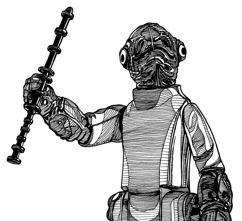 This is the original pen work of an Admiral Ackbar figure from my "Figure 80" Bottleneck show. Based on the original Kenner action figure and measuring 9" x 12", this ink drawing was scanned into the computer and manipulated to it's final appearance in the print. Micron pens and Copic marker on Caslon 18lb Marker Paper.